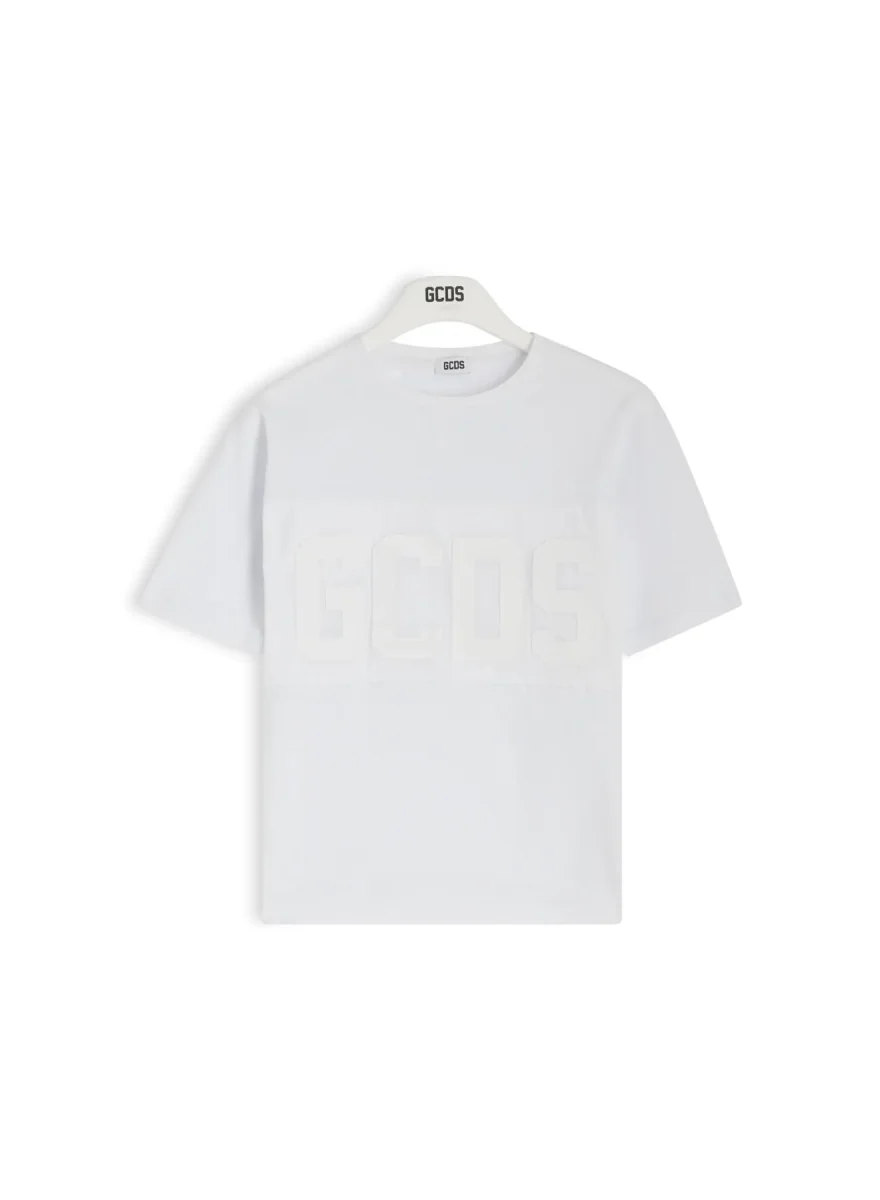T-shirt GCDS bimbo, modello girocollo e maniche corte, dettaglio con logo in contrasto, colore bianco
