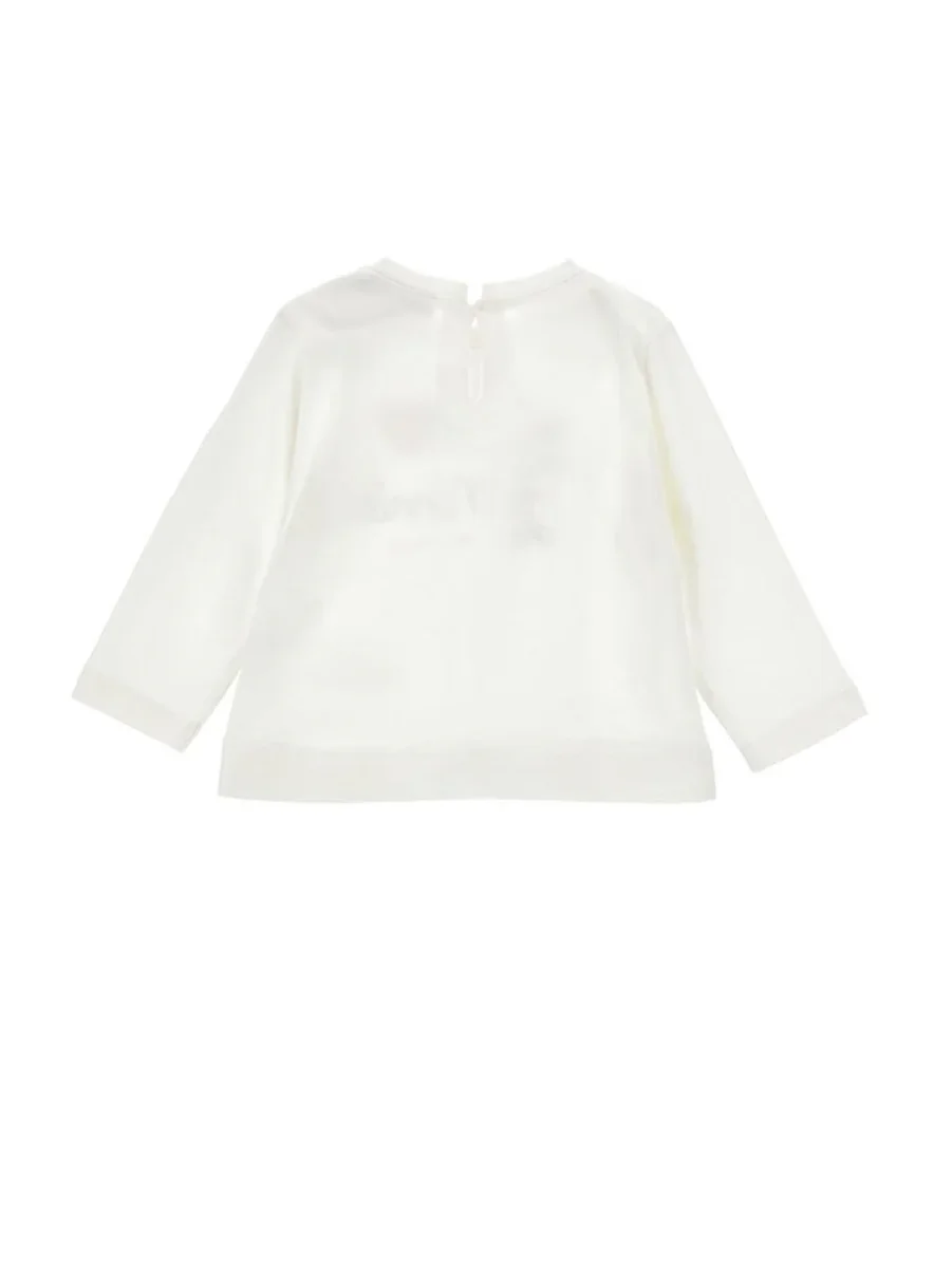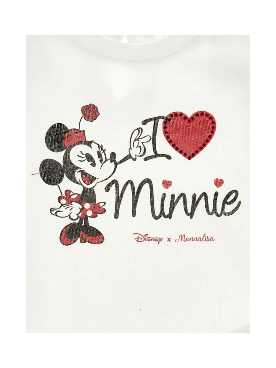 T-shirt Monnalisa neonata, girocollo e maniche lunghe, dettaglio con stampa Minnie in contrasto con applicazioni strass, colore bianco