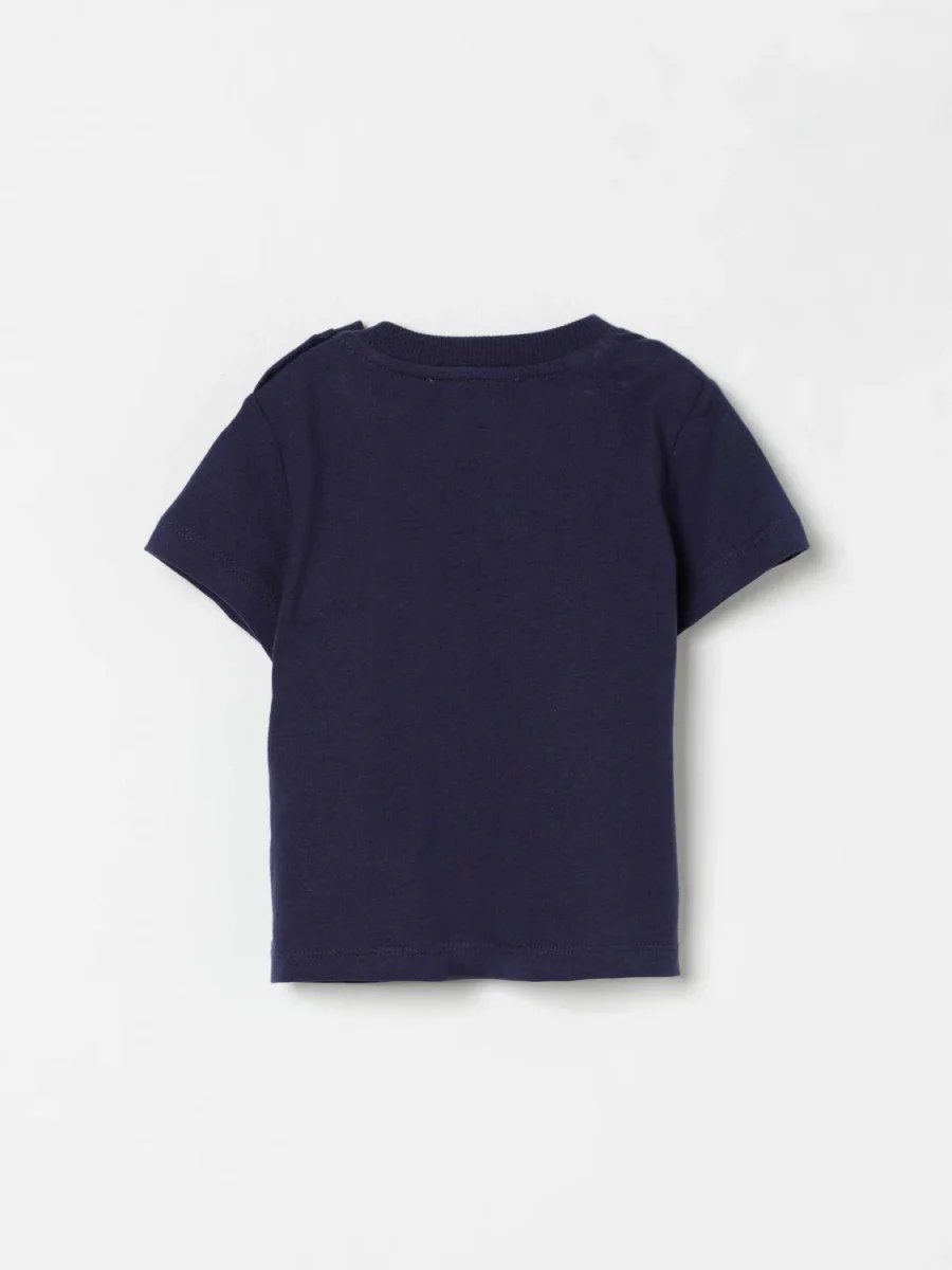 T-shirt con orsetto Toy Moschino Kids, maniche corte e girocollo, con bottoni con automatici sulla spalla, logo in contrasto, colore blu