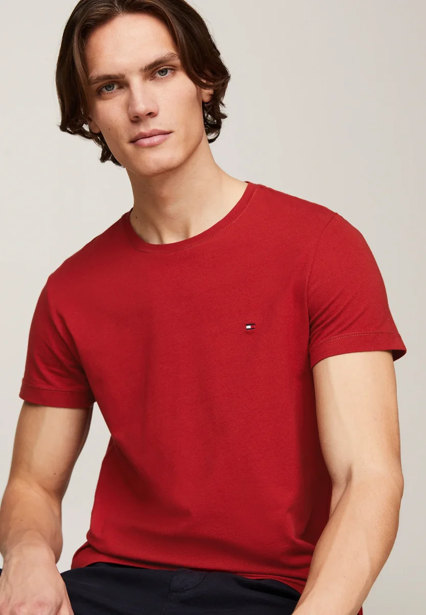 T-shirt slim fit Tommy Hilfiger uomo, modello girocollo e maniche corte, dettaglio logo iconico bandierina ricamato sul petto, colore rosso