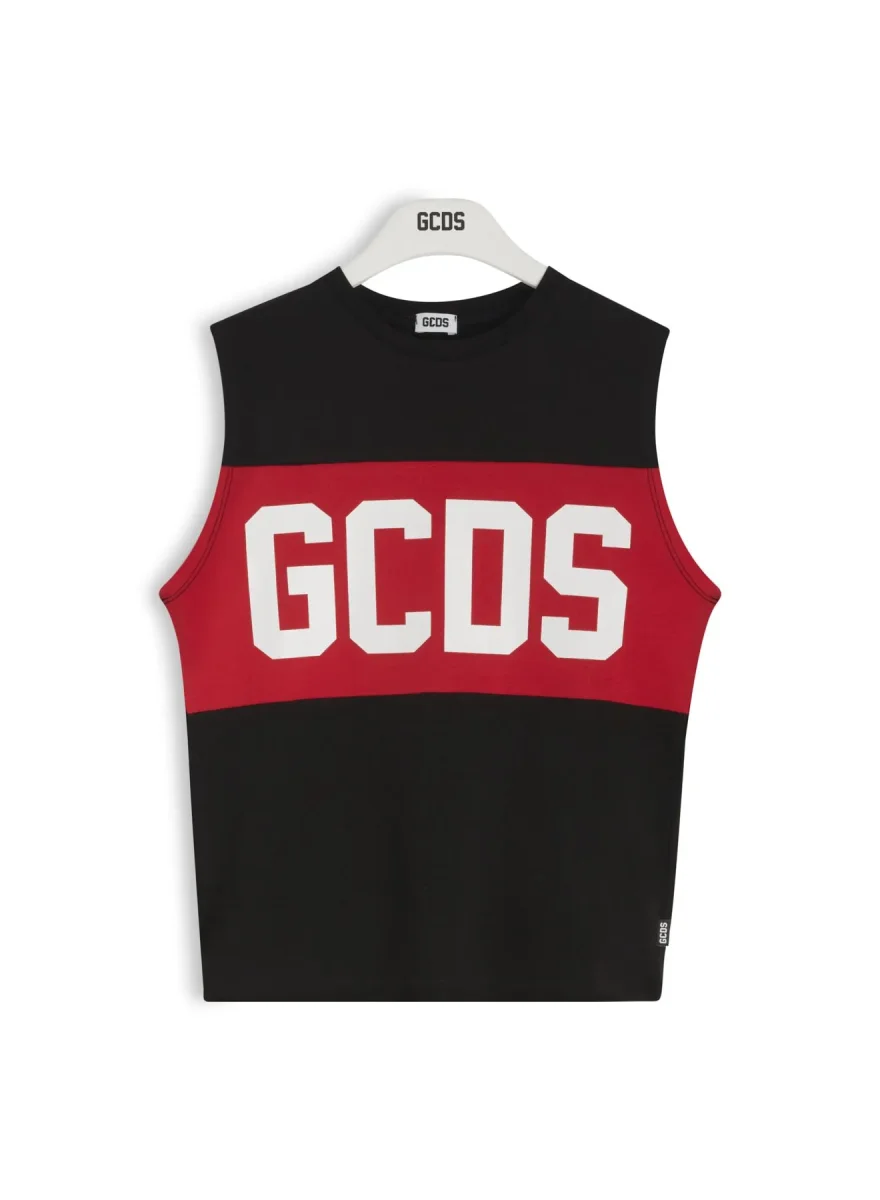 T-shirt girocollo e smanicato, dettaglio con maxi logo in contrasto al centro colore nero