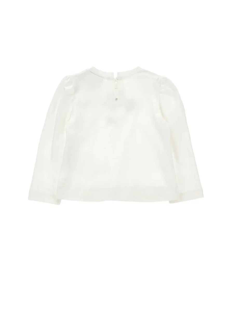 T-shirt Monnalisa neonata, modello girocollo e maniche lunghe, dettagli con cuori e strass in contrasto, colore bianco