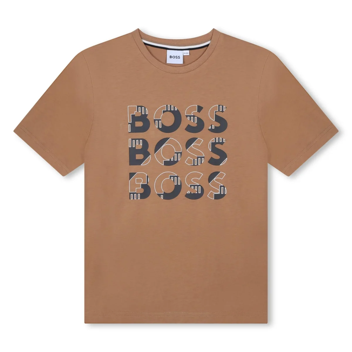 T-shirt Boss bambino, modello girocollo e maniche corte, dettaglio con tre loghi in contrasto al centro, color biscotto