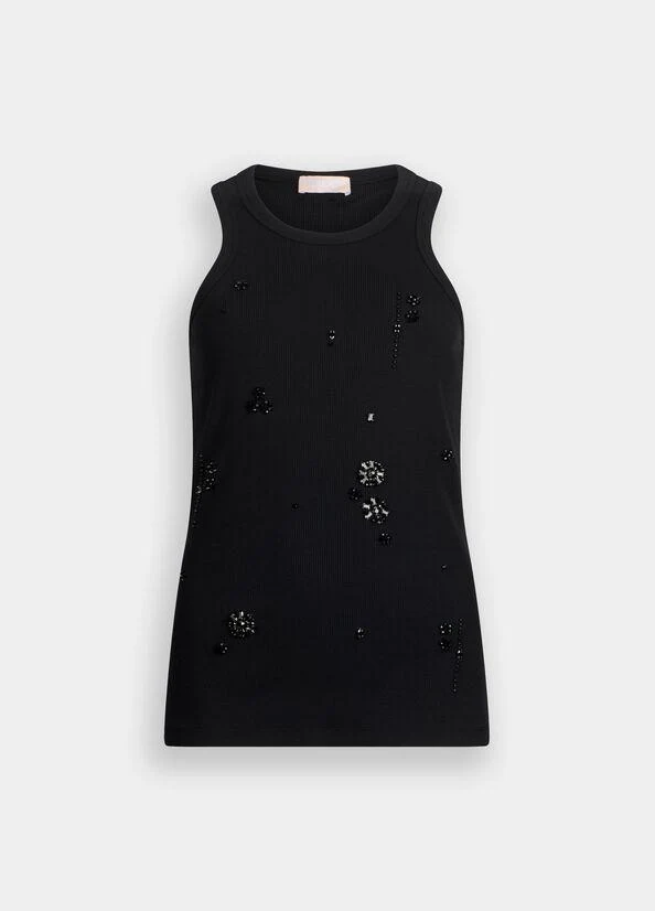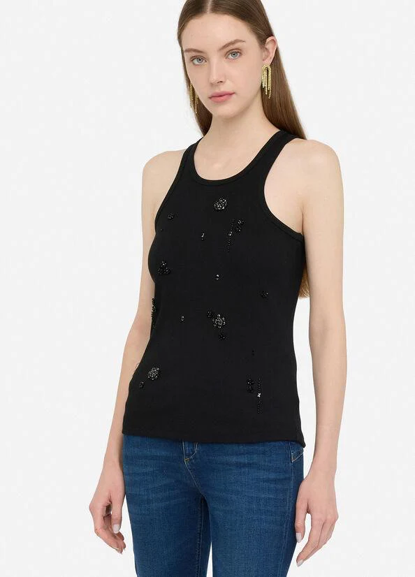 Top in cotone stretch a coste, modello con ricami gioiello, scollo a vogatore, colore nero