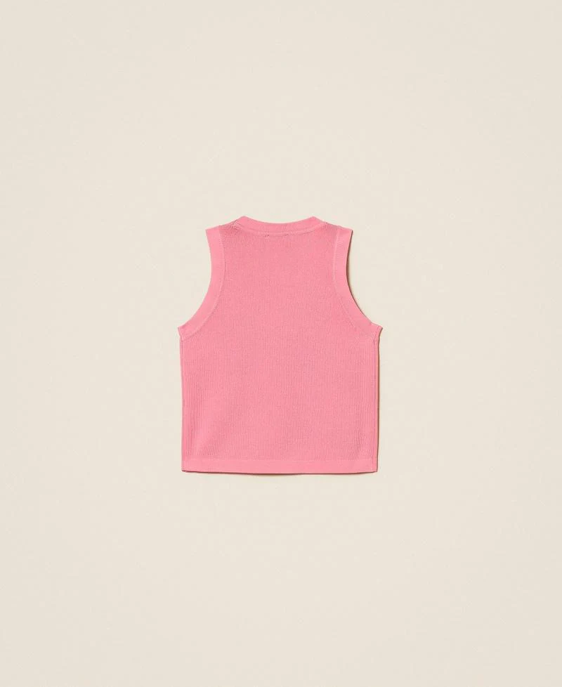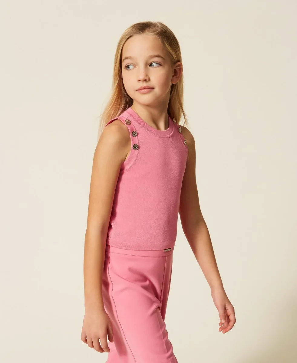 Top in maglia Twinset Girl, collo rotondo, giromanica e bottoni logati in metallo, linea fitted, colore rosa