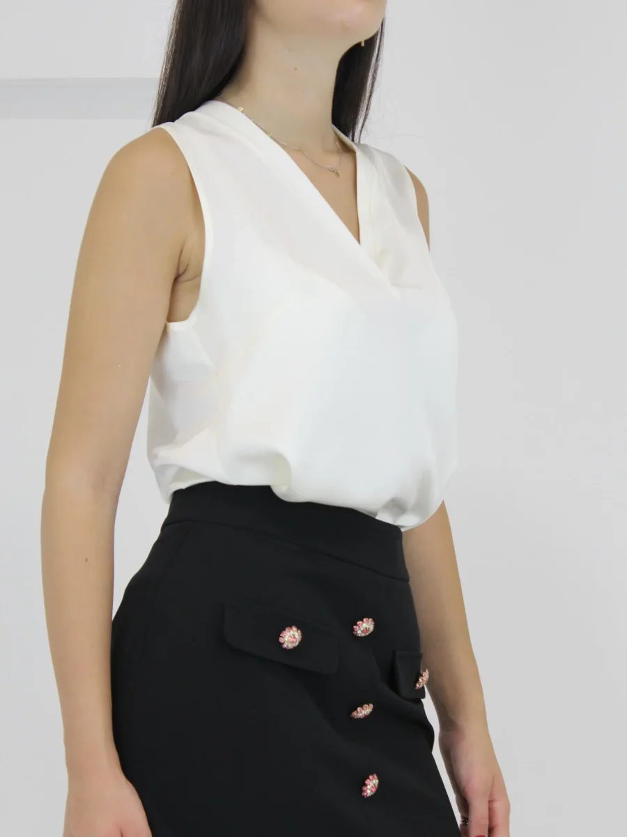 Top Hanita, modello smanicato con ampio scollo a V, colore bianco