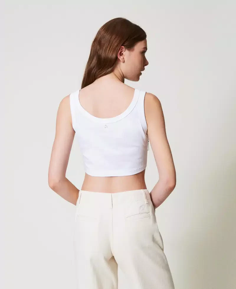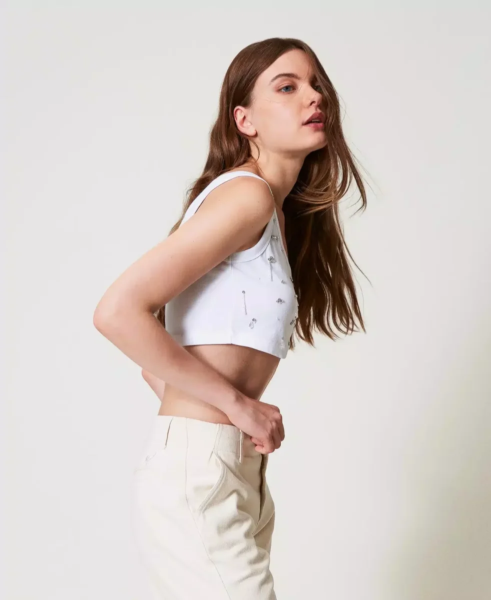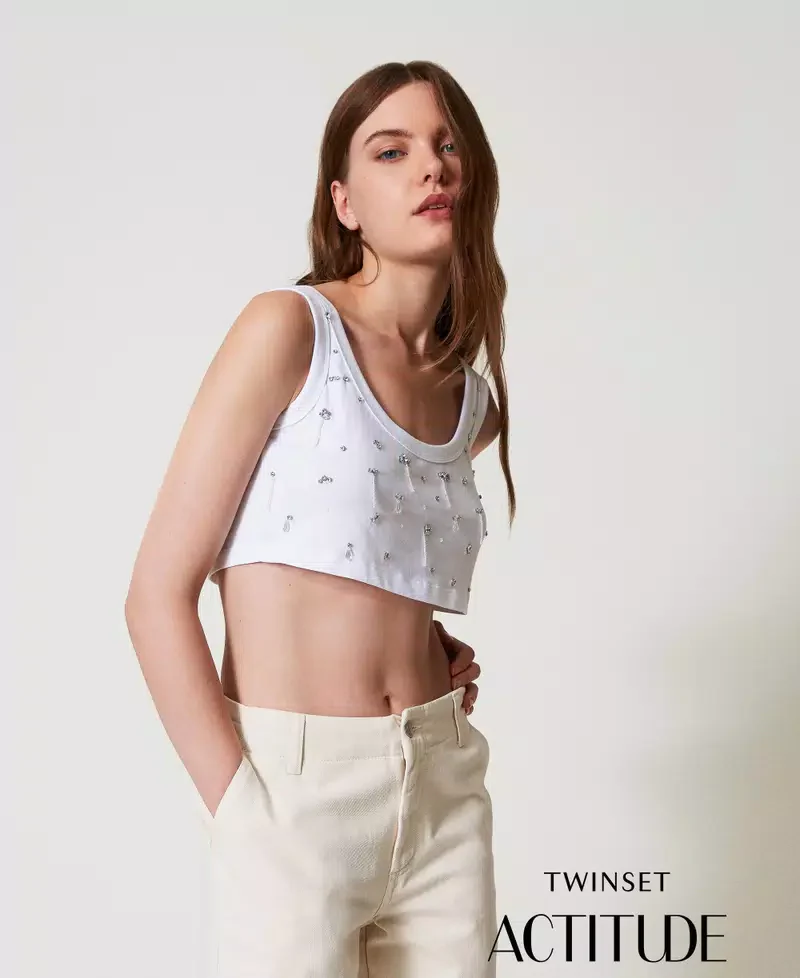 Top cropped in jersey di cotone con ricamo a mano di castoni e perline, scollo rotondo, spalline larghe e linea dritta, colore bianco