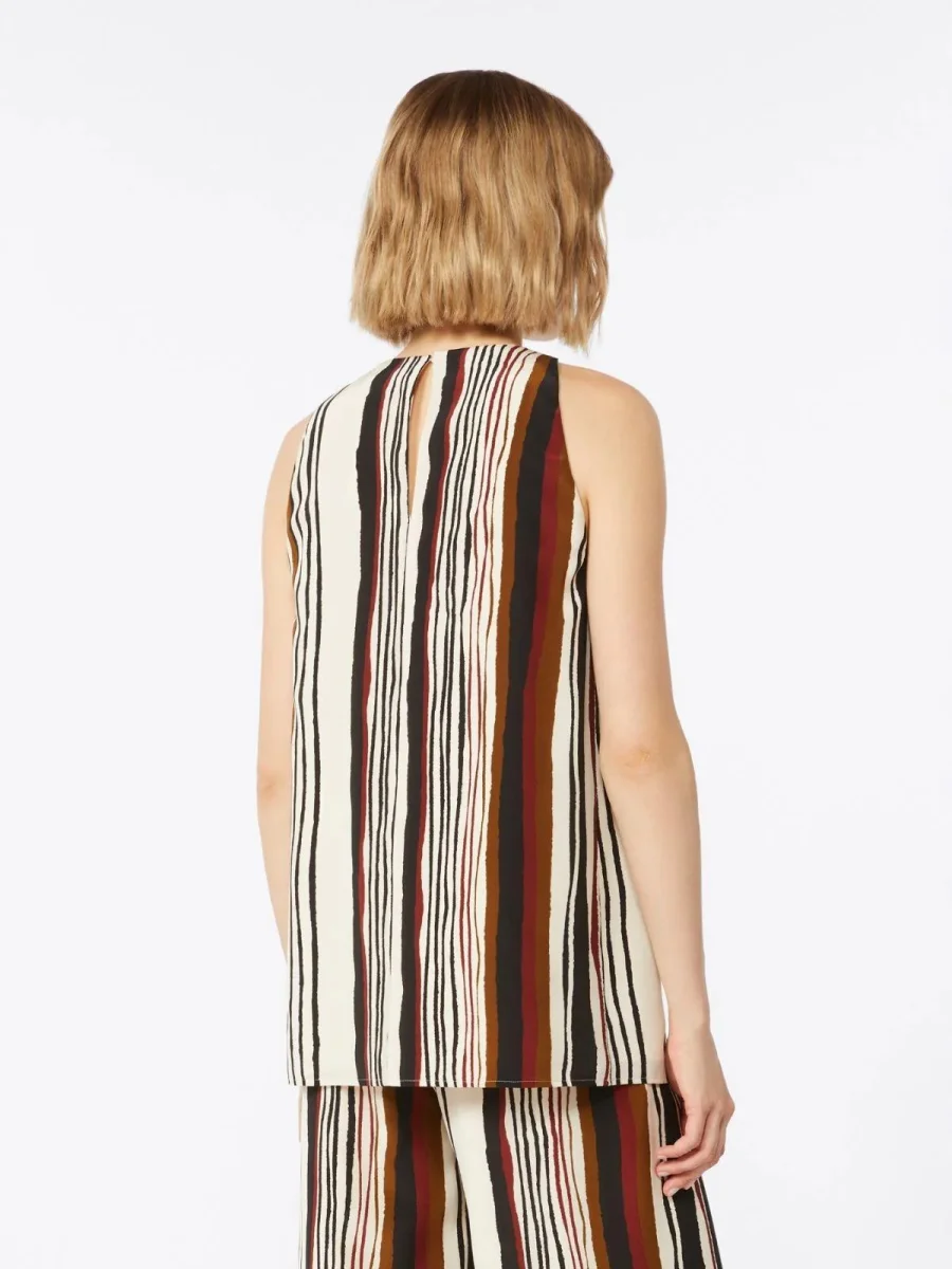 Top smanicato Max Mara Studio, modello in crepe de chine di pura seta, linea svasata, scollo america con spallina ampia, chiusura a goccia con piccolo bottone sul retro, multicolor