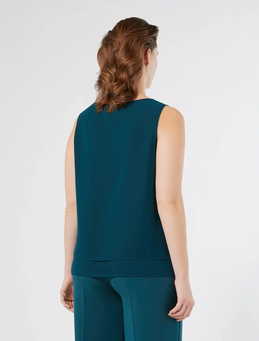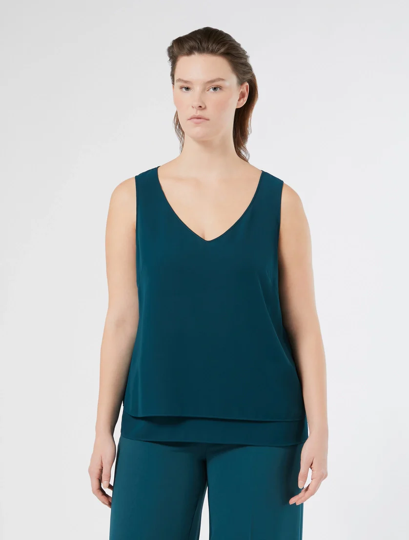 Top in crepe georgette, modello linea dritta, costruzione al fondo effetto balza, scollo a V, colore petrolio