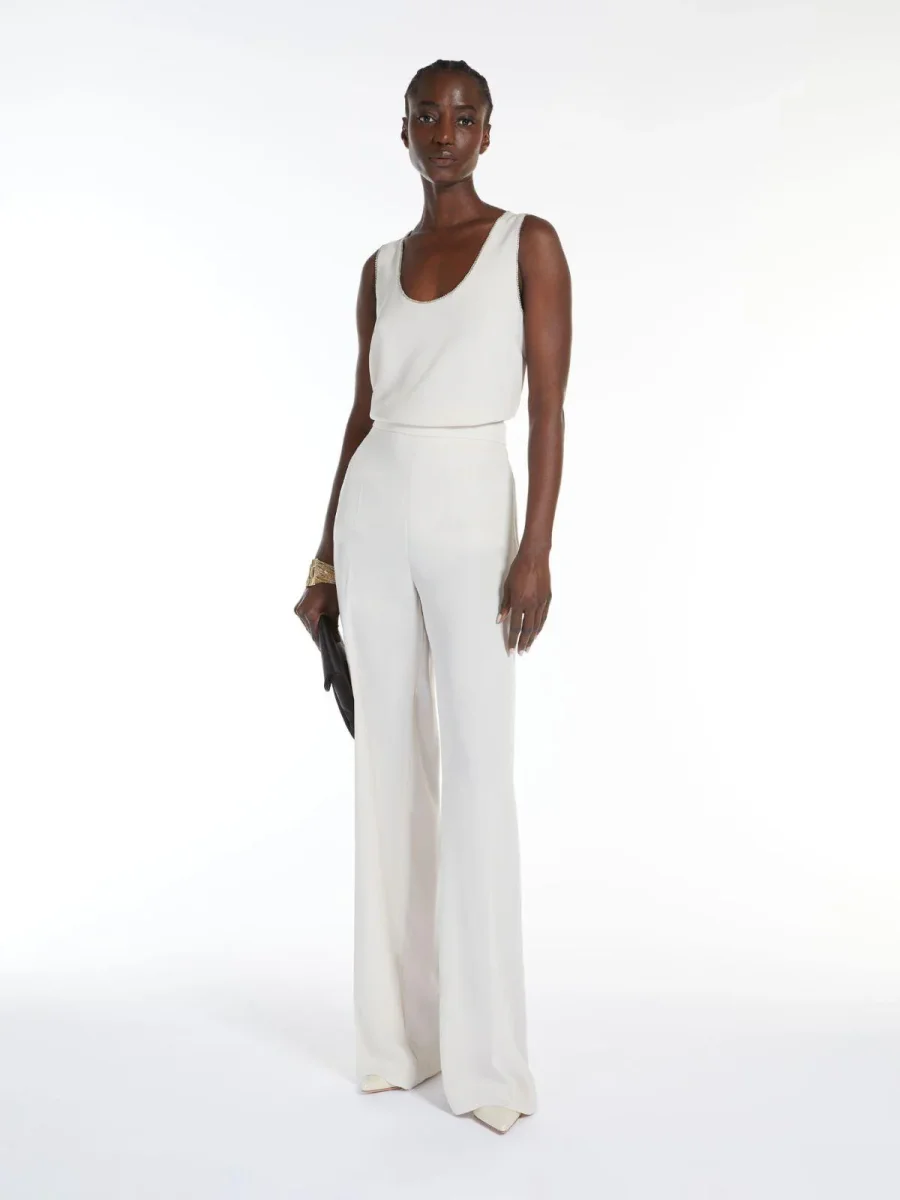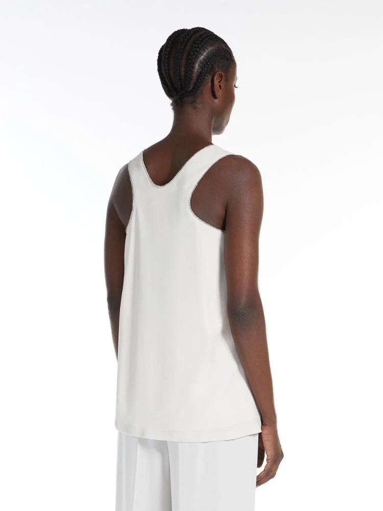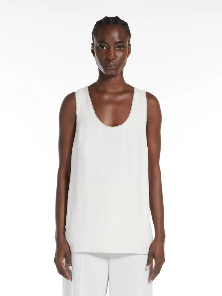 Top smancato Max Mara, modello realizzato in leggero cady, con scollo all’americana sul retro e ampio, scollo tondo sul davanti, profili illuminati da piping in strass, colore beige