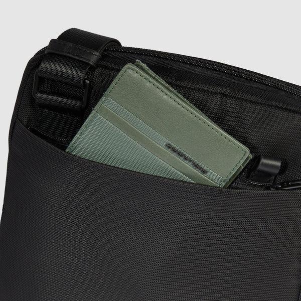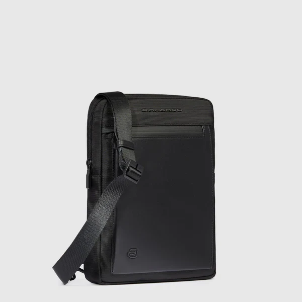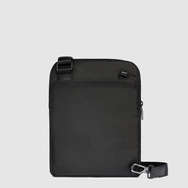 Tracolla in tessuto riciclato, inserti in pelle, scompartimento interno porta Ipad da 11″, chiusura con zip e tracolla cucita, colore nero