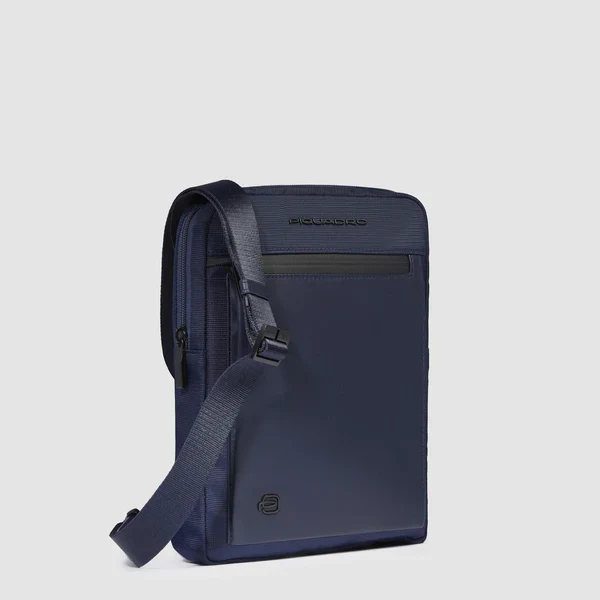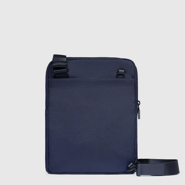 Tracolla in tessuto riciclato, inserti in pelle, scompartimento interno porta Ipad da 11″, chiusura con zip e tracolla cucita, colore blu