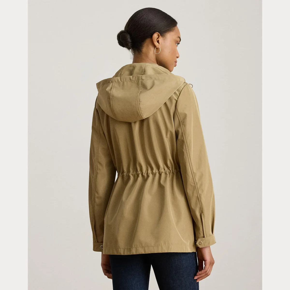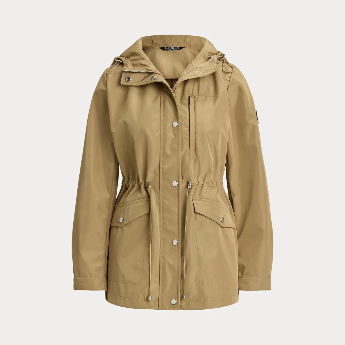 Cappuccio con coulisse integrata. Zip integrale frontale con patta antivento con automatici. Bottoni automatici in metallo personalizzati con logo “LRL”. Maniche lunghe con polsini con automatici. Tasca con cerniera sul petto a sinistra. Due tasche applicate con patta e automatici in vita. Toppa con logo in gomma sulla manica sinistra in alto. Logo “Lauren Ralph Lauren” ricamato sulla patta interna. Coulisse elastica in vita