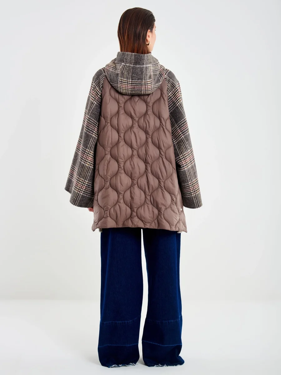 Trench cappa maniche lunghe ampie con cappuccio, chiusura frontale con cerniera e bottoni a pressione, tasche laterali, dettaglio con tessuto imbottito