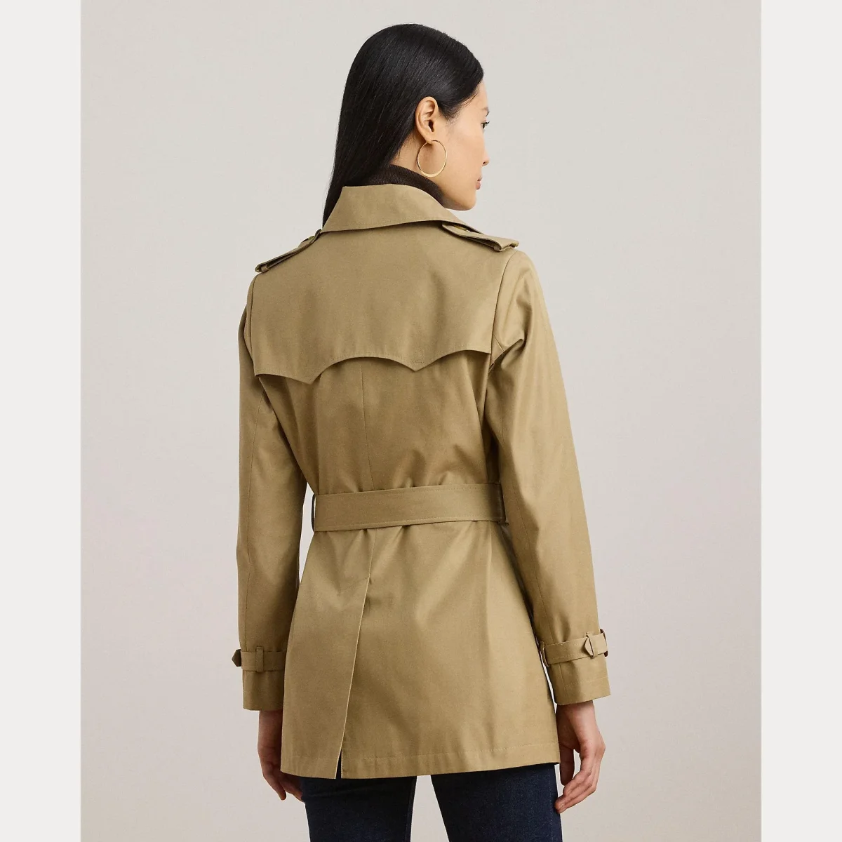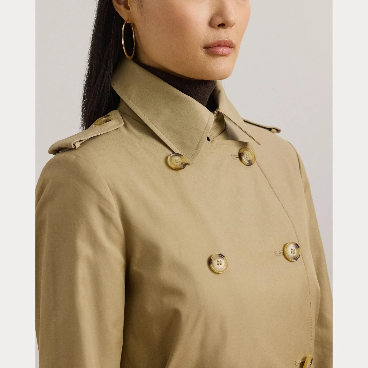 Trench corto doppiopetto, modello in misto cotone, cintura con fibbia, bottoni incisi con logo del brand LRL, colore beige