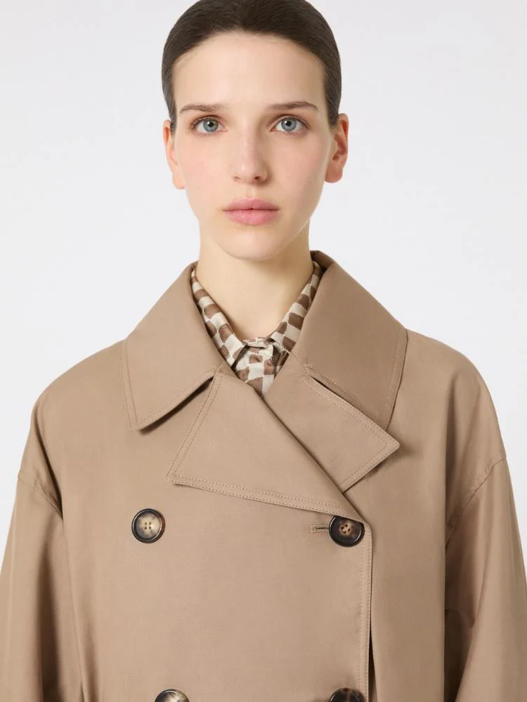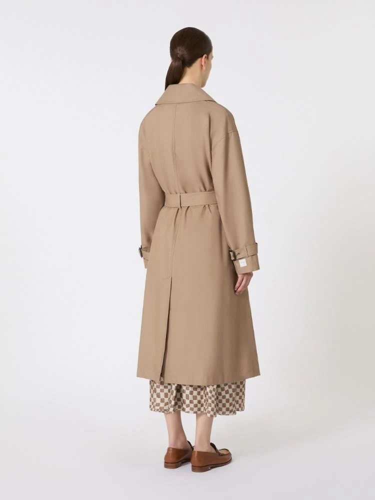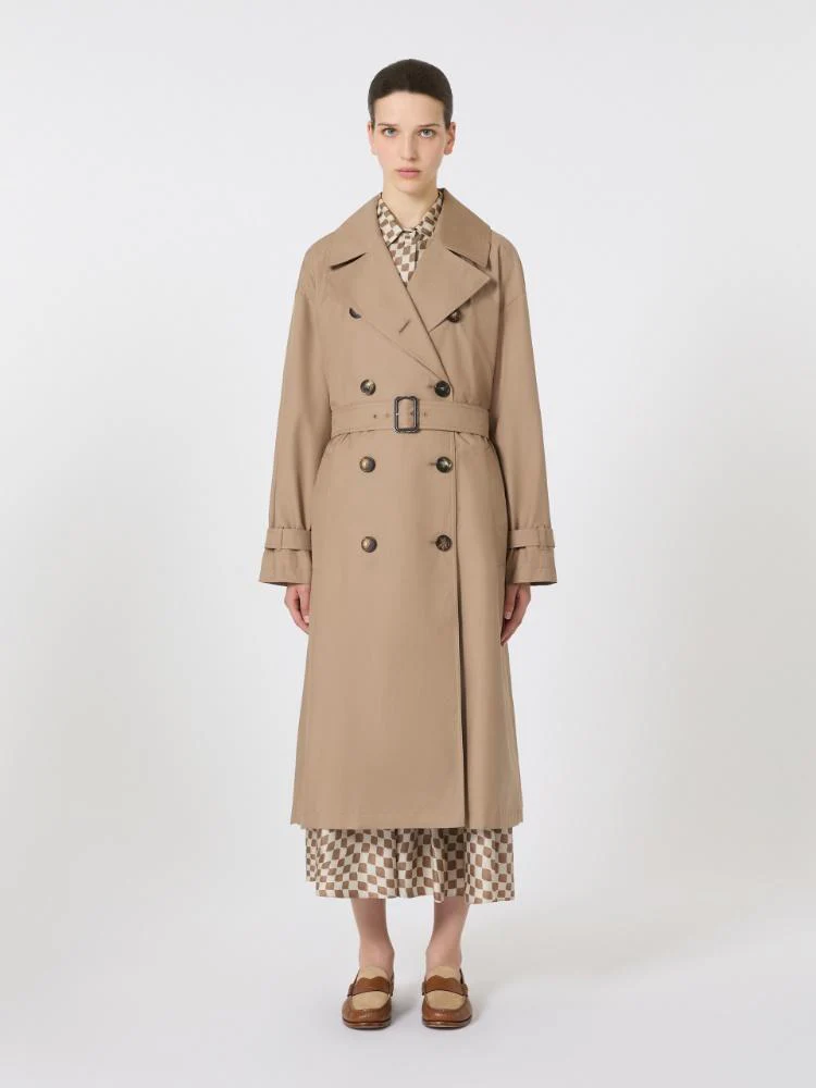Trench lungo Max Mara linea The Cube, modello in twill di cotone antigoccia, collo a rever con logo a rilievo sul retro, maniche lunghe, chiusura doppiopetto con bottoni in corno, colore cammello