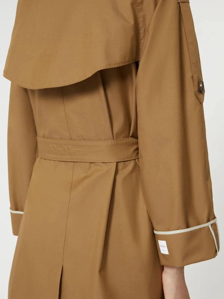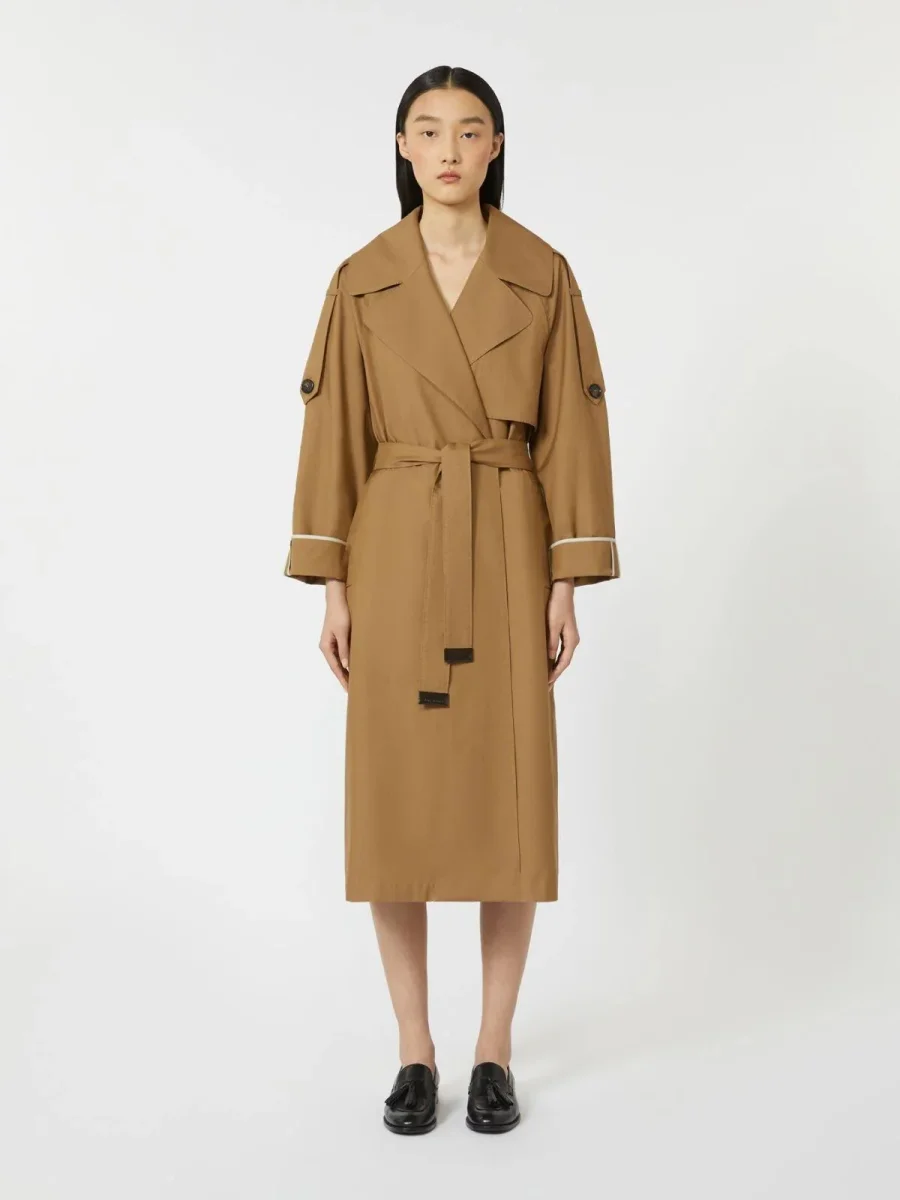 Trench over in twill antigoccia, linea svasata con profondo spacco centrale sul retro, collo a rever ampio, maniche raglan con risvolto cucito e alamari sulle spalle, tasche a filettone e mantellina sulla schiena, colore beige