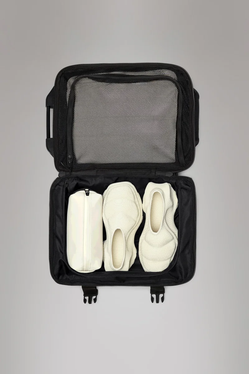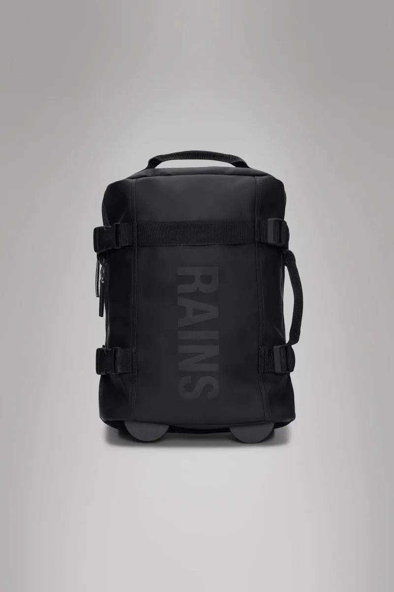 Trolley cabin bag realizzato in tessuto impermeabile firmato Rains, chiusura con cerniera rivestita tono su tono, custodia a portafoglio con due chiusura in mesh, cinghie di compressione laterali, manico di trasporto, colore nero