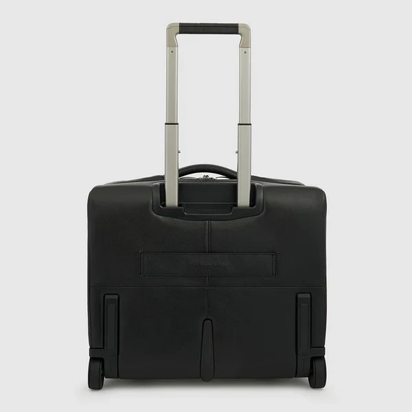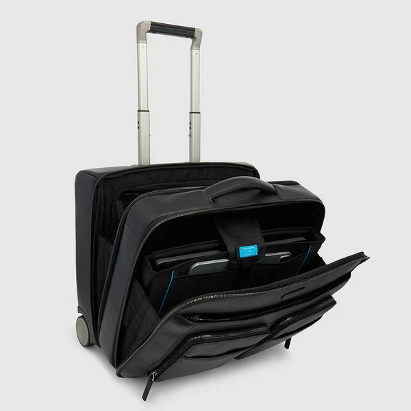 Trolley pilota in pelle Piquadro, con pannello organizzato rimovibile, porta pc da 15.6″, lucchetto TSA e protezione anti urto, manici a scomparsa, portachiavi rimovibile interno, colore nero