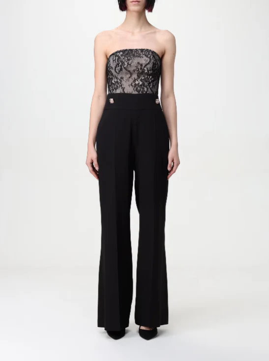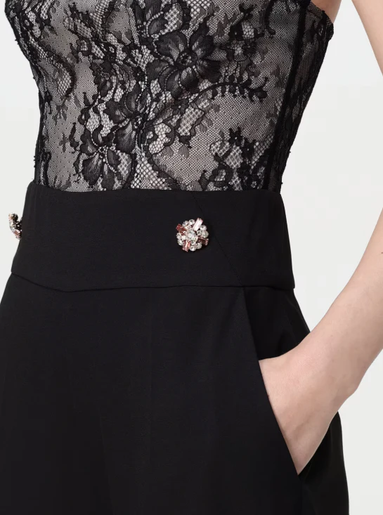 Tuta Hanita donna, modello con applicazione bottoni gioiello, scollatura retta, senza spalline e maniche, chiusura posteriore con zip, tasche america, inserti in pizzo, colore nero