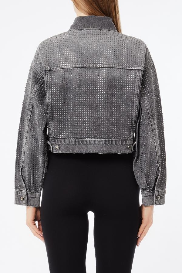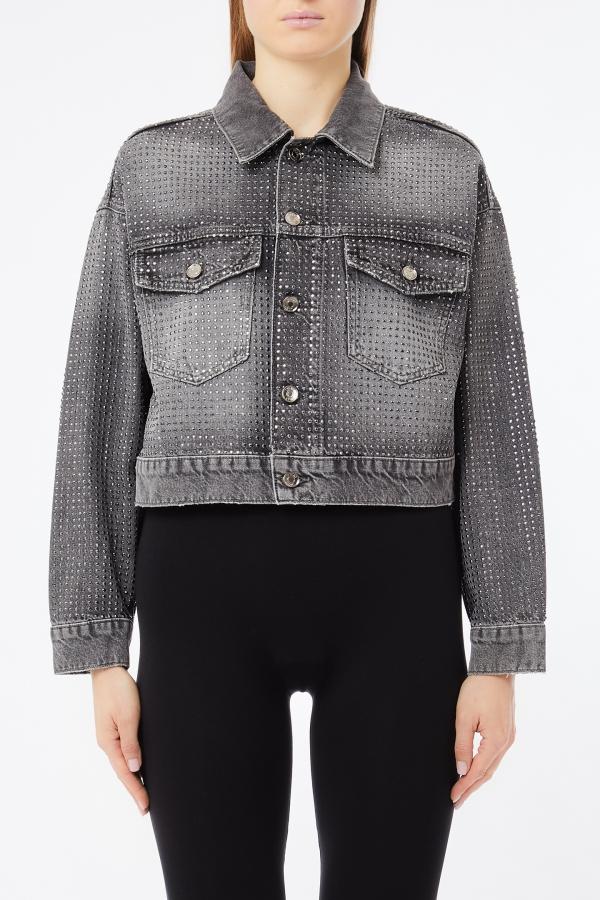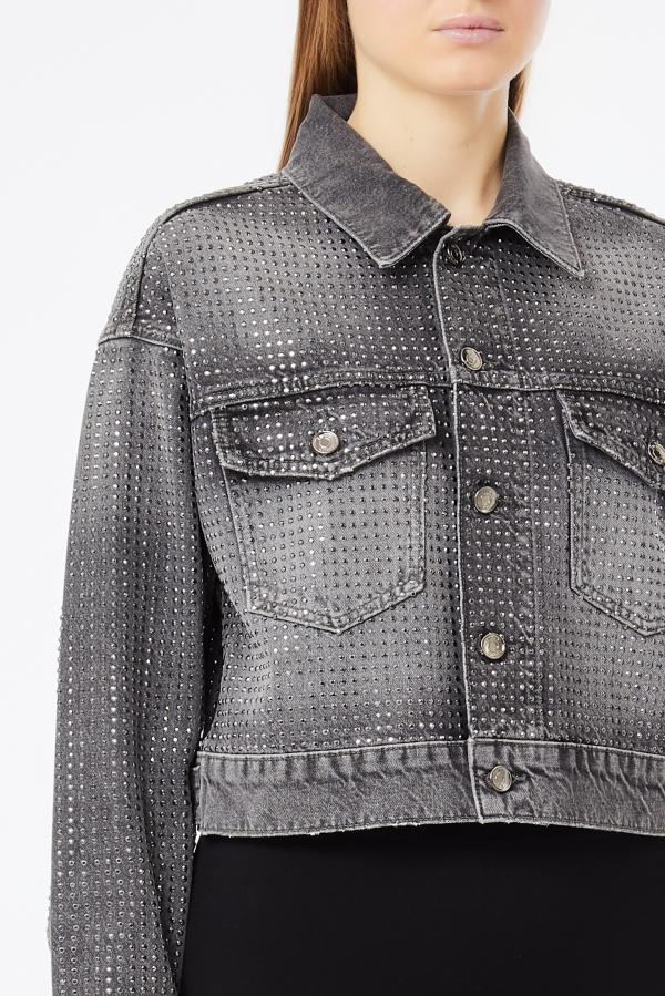 Giubbino in denim superstars, chiusura bottoncini, dettagli applicazioni all over, colore grigio denim