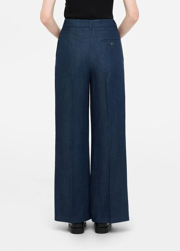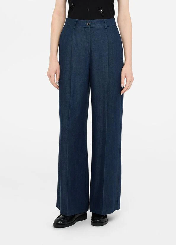 Pantalone in denim cin pinces e piega stirata, vita alta e gamba flare, tasche sui fianchi, tasca a filetto con bottone sul retro, chiusura con bottone e zip nascosta, colroe blu