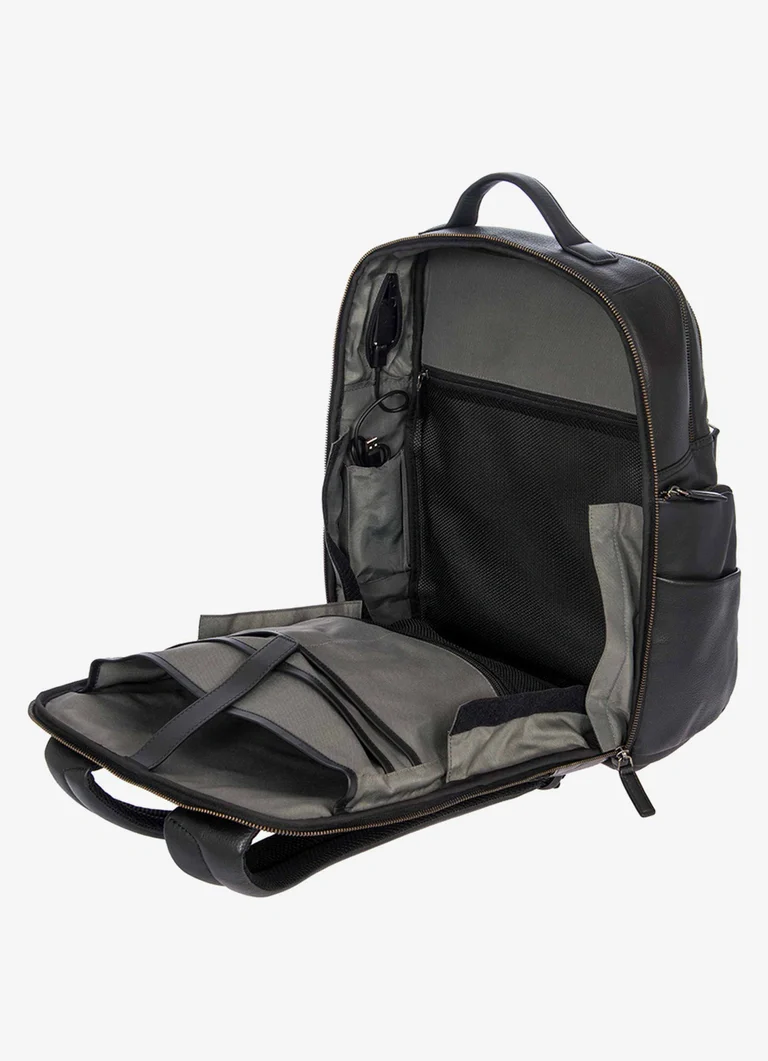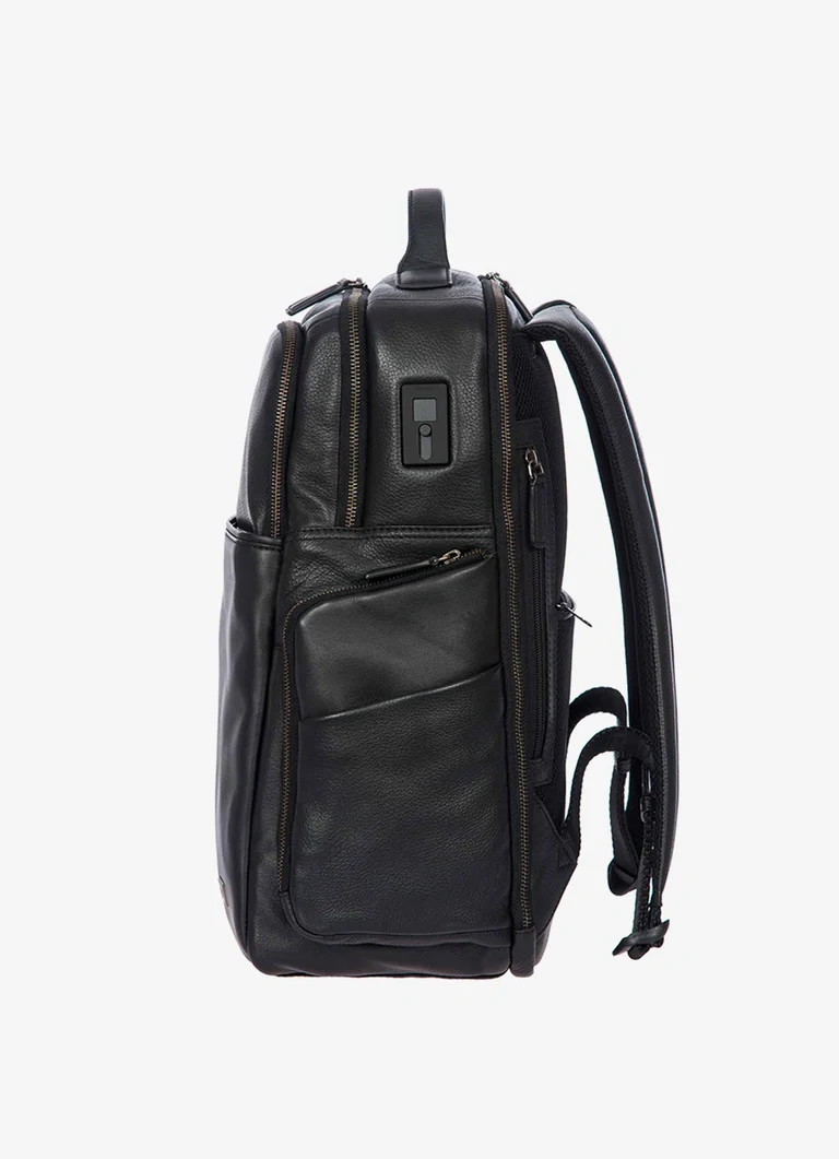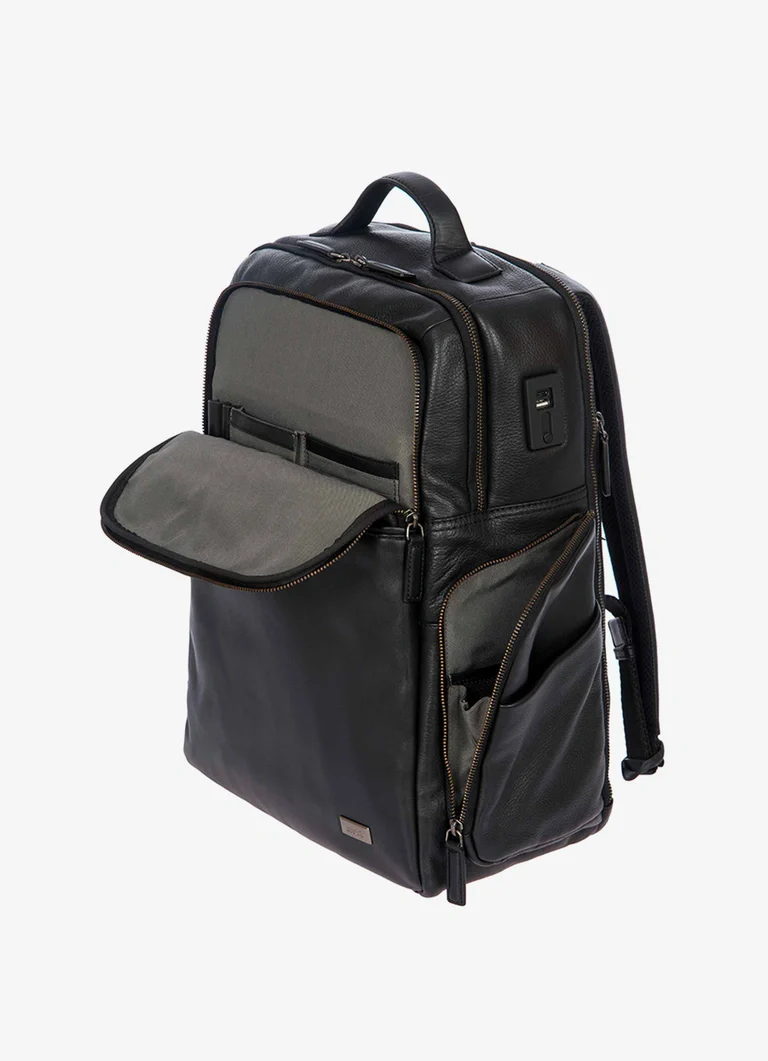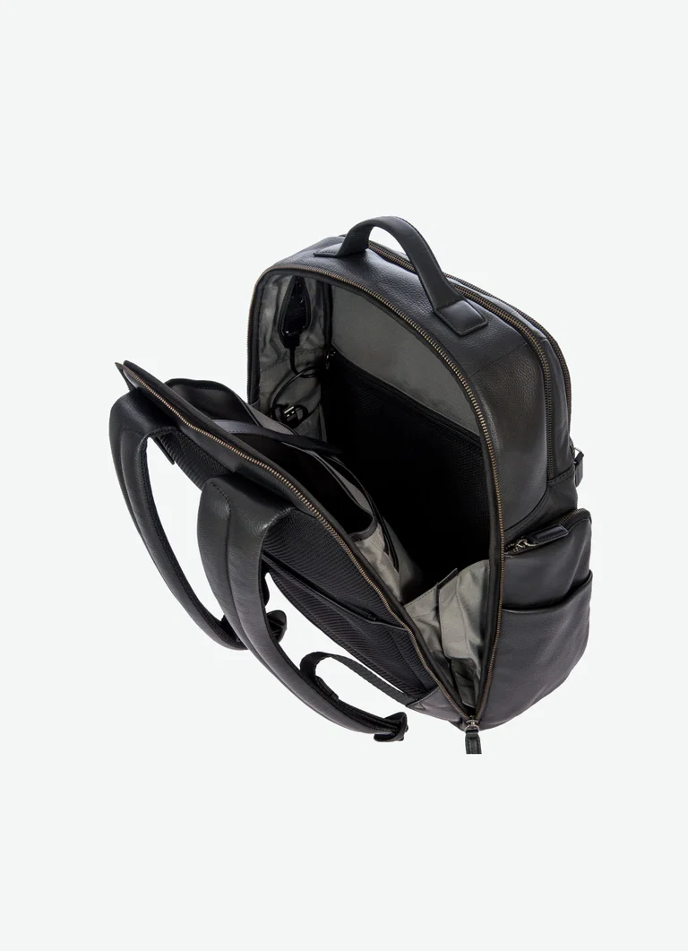 Zaino in pelle uomo Bric’s, collezione Torino con doppia lavorazione in pelle una liscia e una bottalata. Tasca frontale con zip nascosta logata e tasca doppia frontale, scompartimento interno da 15.6″. Adattatore USB modello A e C, colore nero