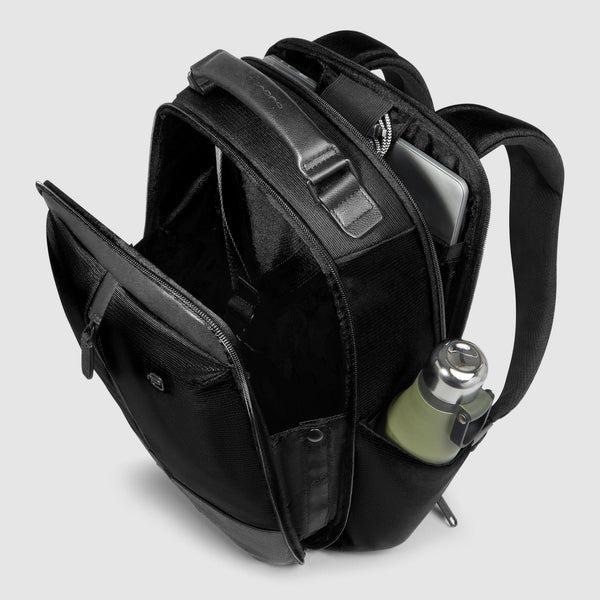 Zaino da Viaggio Piquadro, modello in tessuto riciclato, con scompartimento in pelle porta Pc e Ipad, due scompertimenti con tasche airpods, protezione anti urto RFID, colore nero