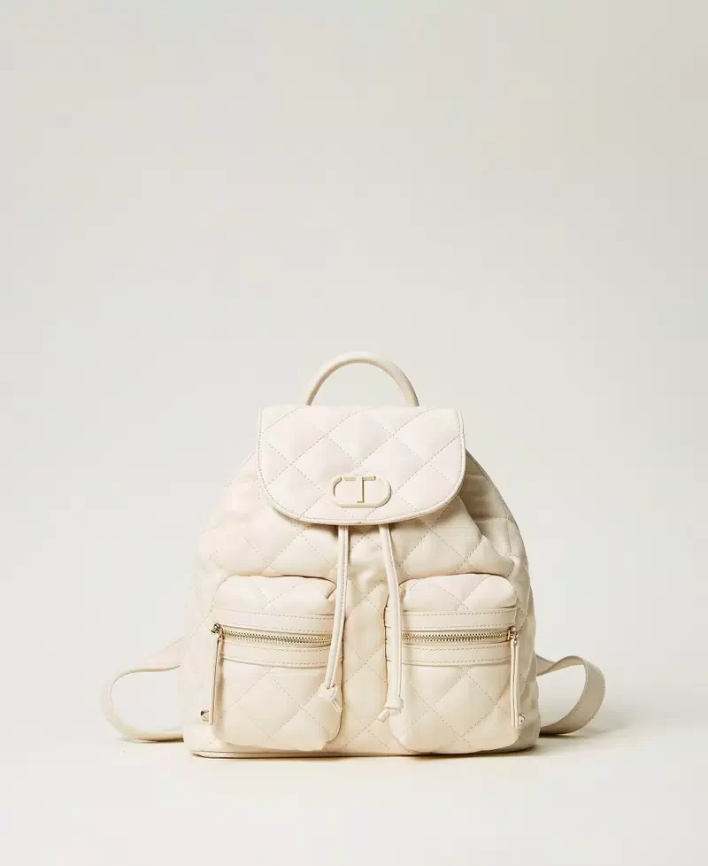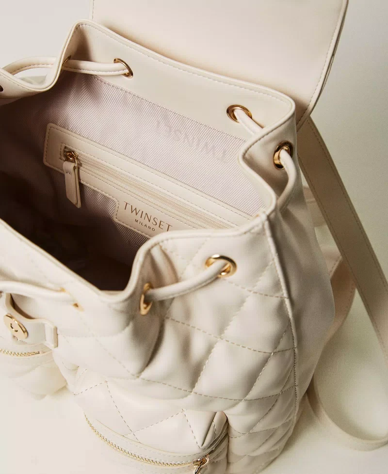 Zaino Twinset donna, modello effetto nappa di vitello trapuntata con logo oval T verniciato in tinta, chiusura con patta e magnete, coulisse interna regolabile, tasche davanti con zip e borchie, colore bianco